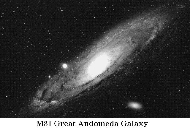 The Great Nebula in Andromeda is a classic spiral nebula. At the leading edges of reaching rotating arm, a wave of gas compression occurs triggering areas of star formation. Andromeda is nearly edge on in this image but it would look like M74 if we saw it face on.