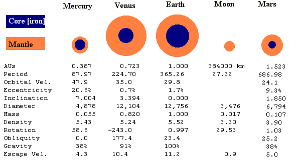 Notice that the surface gravity of Mercury and Mars are both about 38% of the tug we feel hear on Earth. However Mercury's mass is only about half that of Mars. Why then is the surface gravity about the same? It lies in the fact that Mercury has a diamter only 72% that of Mars. If each had the same size globe, Mercury's gravity would be roughly half that of Mars. Gravity increases as the inverse square of the diameter. The inverse of 72% squared is just about two, with the result that half of two yields the same intensity of gravity. A similar line of reasoning explains why the Moon's gravity is about 1/6th that of Earth while its mass is only slightly more than 1/80th that of Earth.